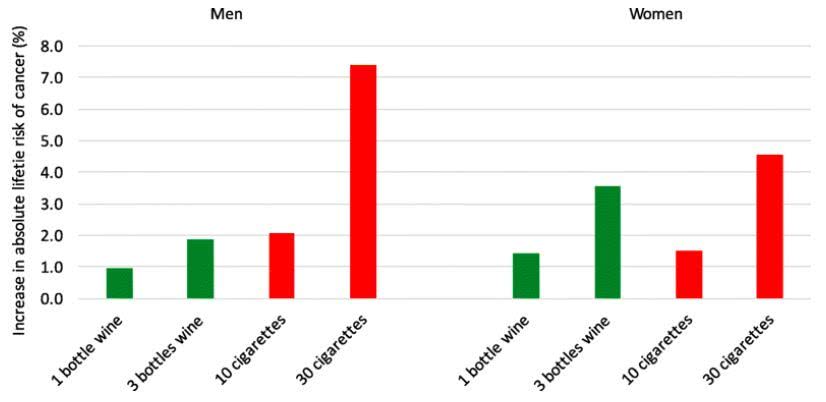 數據顯示,在不吸煙者中,每周喝一瓶葡萄酒與男性終生癌癥風險額外增加1%有關,與女性終生癌癥風險額外增加1.4%有關。研究人員解釋,女性風險更高的主要原因是酒精和乳腺癌風險相關,而在男性中,酒精主要與