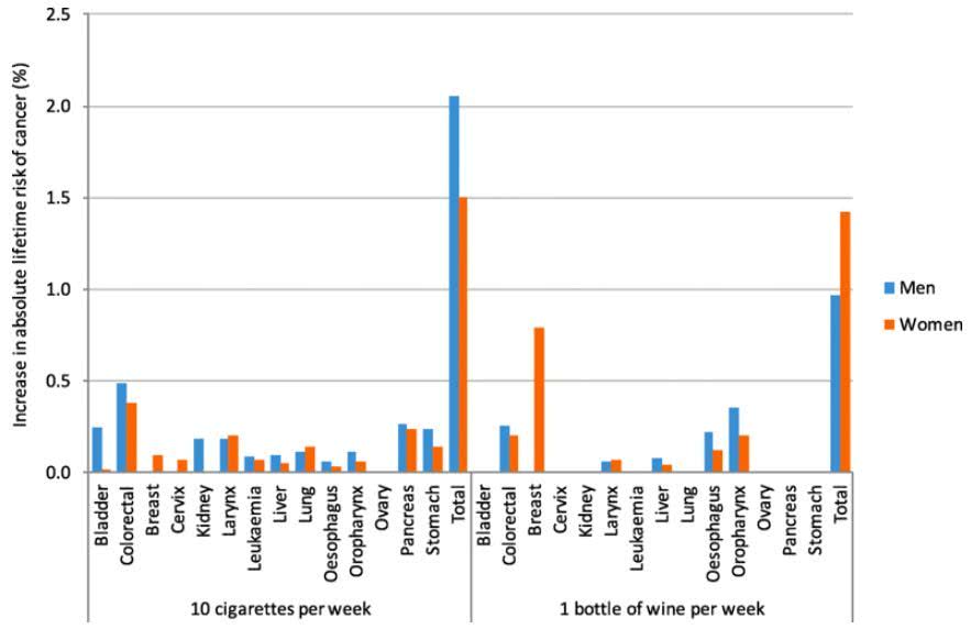 ▲每周吸十支煙(非飲酒者)或喝一瓶紅酒(非吸煙者)帶來的癌癥絕對終生風險(圖片來源:參考資料[1])