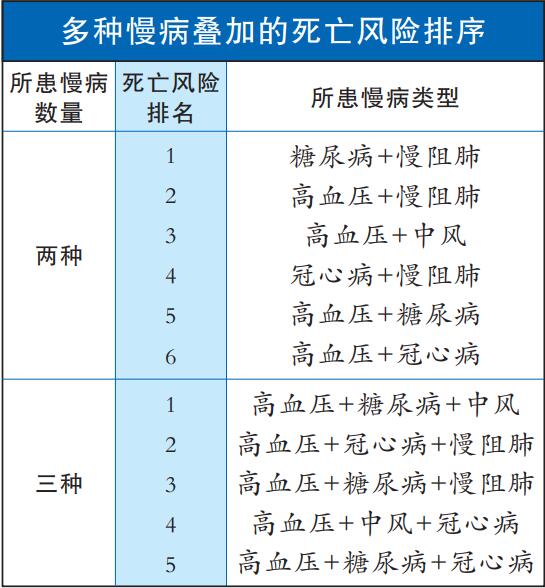 “共病”更是加劇了慢病威脅。6月5日,鄭州大學(xué)公共衛(wèi)生學(xué)院發(fā)表的一項(xiàng)對(duì)5萬名65歲及以上中國人的研究發(fā)現(xiàn),多發(fā)慢病與全因死亡率呈正相關(guān)。與沒有慢病的參試者相比,具有1、2和3種慢病者全因死亡率分別增加45%、72%和115%(死亡風(fēng)險(xiǎn)排序見圖表)。此外,吸煙飲酒、體重過輕、運(yùn)動(dòng)不足的人死亡風(fēng)險(xiǎn)較高。