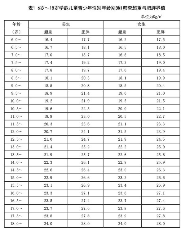 《共識》指出,我國兒童肥胖癥呈現低齡化快速增長趨勢,2015~2019年,6歲以下兒童超重和肥胖發生率分別為6.8%和3.6%,6歲以上超重和肥胖發生率則分別躍升至11.1%和7.9%。廣州中醫藥大學第三附屬醫院兒科主任、主任中醫師陳文利接受“環球時報健康客戶端”記者采訪時介紹:“衡量一個孩子是否超重或肥胖,可以根據《學齡兒童青少年超重與肥胖篩查》(見下表)進行判斷。比如,一個4歲女孩兒,體重為25千克,身高1.1米,其體質量指數界值為25÷1.12=20.6,屬于肥胖,需要及時到兒科進行評估。”